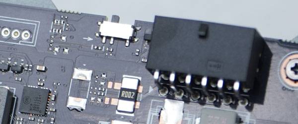 12VHPWR 커넥터 측면에는 사용자가 선택할 수 있는 바이오스 전환 스위치가 배치되어 있는데, 사진과 같은 위치는 고성능, 반대편은 저소음 바이오스다. 각 바이오스에 따른 GPU 및 VRAM, 전력 제한 특성은 동일하다.