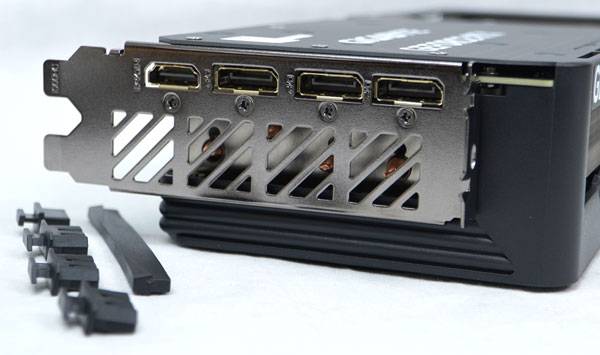 출력 포트는 3개의 DP 1.4a 포트와 1개의 HDMI 2.1a 포트를 갖췄고, 메인보드 장착을 위한 인터페이스 슬롯과 출력 포트 오염 방지를 위해 보호캡도 기본 제공된다. 보관 중이거나, 미사용 포트에는 보호캡을 씌워놓자.
