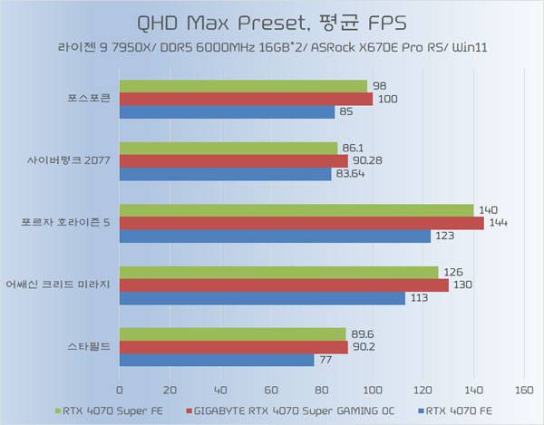 먼저 RTX 4070의 타겟 해상도인 QHD에서의 결과를 정리했다. 게임마다 다르지만 일반적인 래스터 기반 게임 환경과 레이 트레이싱 게임 환경 모두 최대 4프레임가까이 높은 성능을 기대할 수 있다.