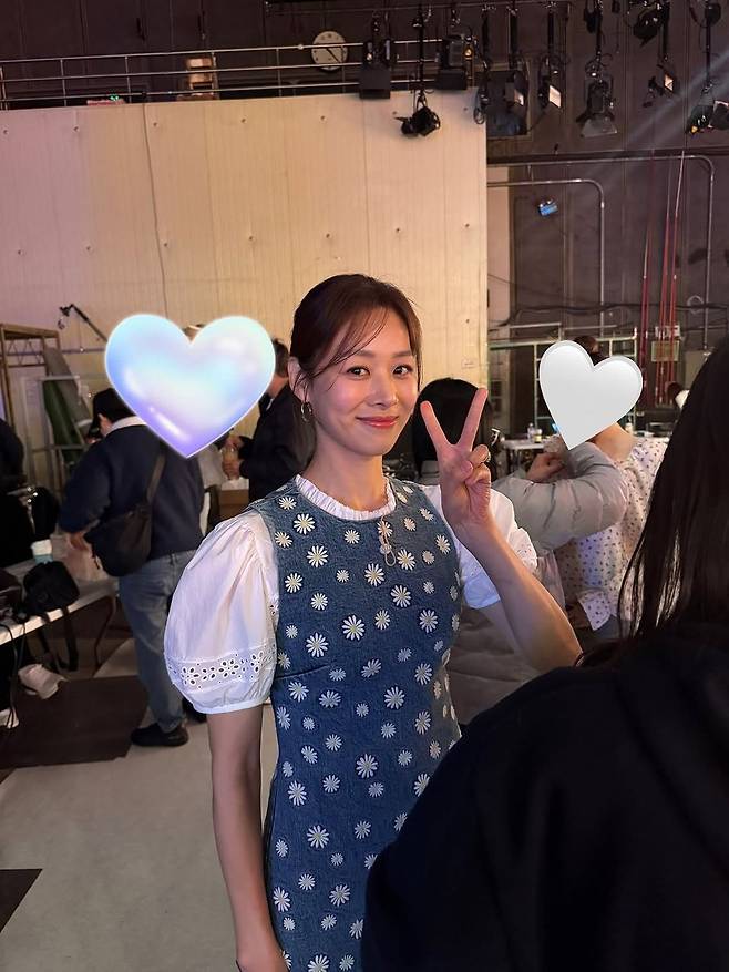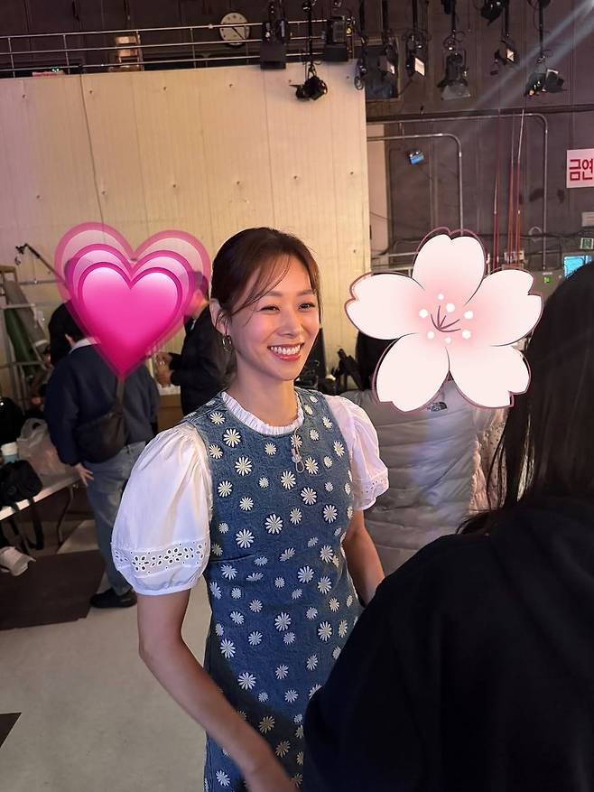배우 장신영이 인스타그램을 통해 공개한 근황 사진 속 청순하고 사랑스러운 스타일링이 눈길을 끈다. 방송 촬영 현장으로 보이는 백스테이지에서 포착된 그는 손가락 브이 포즈로 밝은 미소를 지으며 카메라를 응시하고 있다. 특히 이번 착장에서 눈에 띄는 포인트는 데이지 자수가 더해진 니트 원피스와 퍼프소매 블라우스의 조화다.