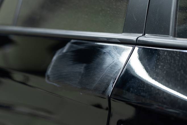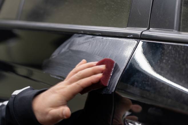 자세한 효과를 직접 느껴보기 위해, 검은색 아이오닉의 도장면에 사포로 스크래치를 만들었다. 통상 이 정도의 심한 스크래치가 생겼다면, 셀프로 복원하는 건 엄두도 못 냈을 듯하다.