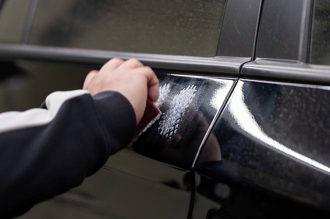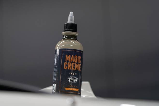 오늘 시공할 제품은 오토그루밍 매직크림으로, 도장면의 흠집이나 워터스팟(물때), 페인트 자국 등 각종 데미지를 안전하고 완벽하게 제거할 수 있는 제품이다. 가장 돋보이는 부분은 ‘광도’. 기존 컴파운드 제품은 스크래치는 지우지만 얕은 데미지를 남겨 도장면의 광도를 저하시켰다. 때문에 광택기 없이 수작업으로는 완벽한 작업이 어려웠다.