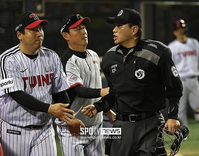 이후 박해민은 헬멧을 집어 던지며 더그아웃으로 향했다. 그런데 송찬의 타석에서 권영철 주심이 LG 더그아웃으로 다가가 언성을 높였다.