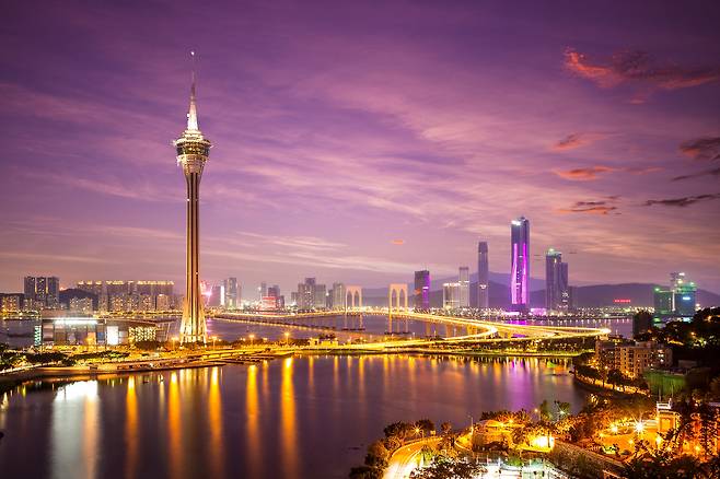 멀리서도 한눈에 들어오는 마카오타워와 바다 위를 가로지르는 대교를 지납니다. 도심과 코타이를 연결하는 이 구간은 탁 트인 바닷바람과 함께 시원하게 펼쳐지는 야경이 일품입니다.