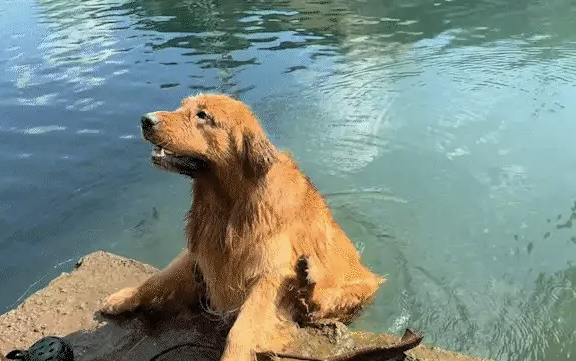 골든 리트리버가 물가에 서 있는 모습은 마치 곡예를 준비하는 작은 배우 같습니다.