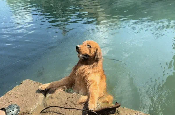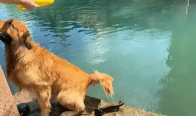 강을 등지고 천천히 뒤로 몸을 젖히는 그의 자세는 무척 부드러워 영화의 슬로우 모션 특수 효과를 연상케 합니다. 그리고 '풍덩' 소리와 함께 골든 리트리버는 매우 자연스럽게 물속으로 들어갔습니다.