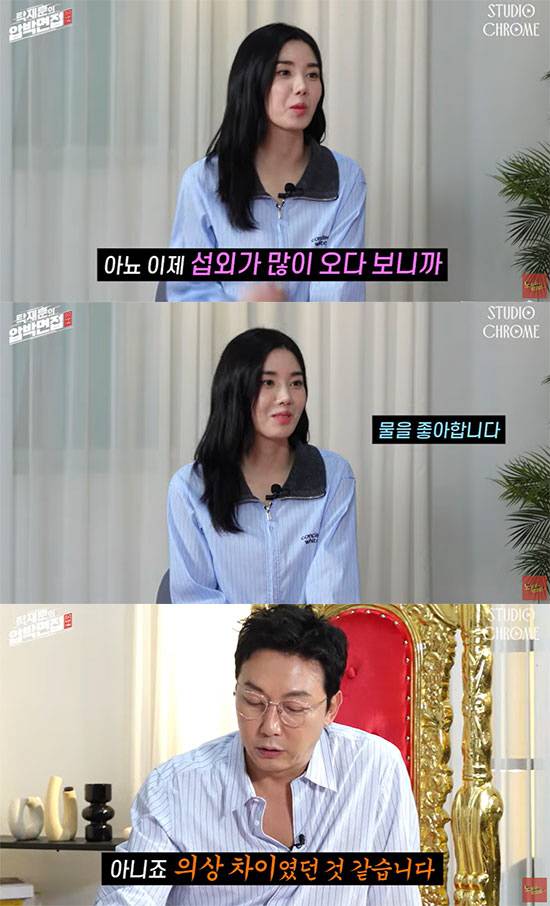 이에 탁재훈은 "아니다. 의상의 차이다"라며 화제를 모은 권은비의 '워터밤' 의상을 언급하자, 권은비는 "워터밤이라 모두가 즐기는 장소여서"라며 수줍게 말했다.