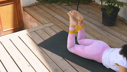 매트 위에 배를 대고 엎드립니다. 다리 사이에 저항 밴드를 착용합니다. 팔뚝을 바닥에 대고 상체를 지탱합니다. 무릎을 구부린 상태에서 발바닥을 천장을 향해 올립니다. 다리를 벌렸다가 천천히 오므리는 동작을 반복합니다.