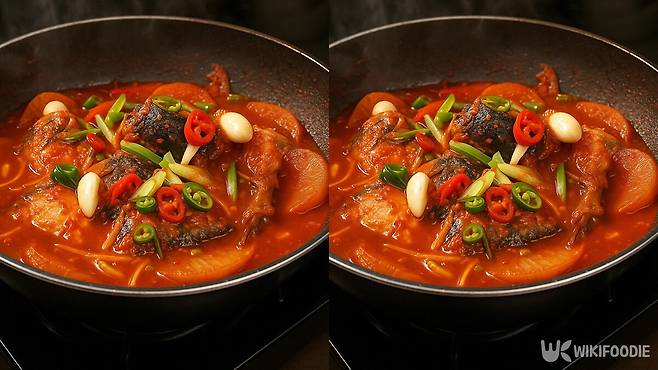 여기서 또 중요한 건 절대 고등어를 뒤집지 않는 것이다. 대신 끓는 국물을 고등어 위에 수시로 끼얹는다. 이 방식은 생선 살을 흐트러뜨리지 않으면서도 속까지 양념이 스며들게 한다. 국물은 조릴수록 진해지고, 고등어는 그대로의 형태로 촉촉하게 익는다.