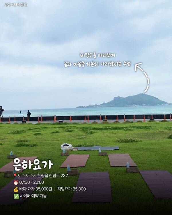 제주에 위치한 은하 요가는 바다 건너 보이는 ‘비양도’ 풍경이 수업의 매력을 더합니다. 요가 수업 후 차를 함께 나누는 ‘차담 요가’는 제주 여행 중 여유를 찾는 이들에게 인기가 많습니다.