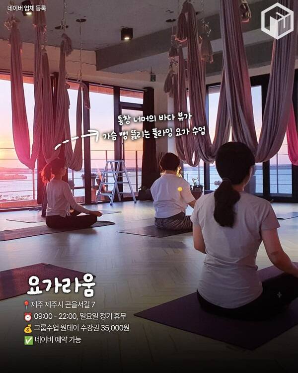 요가라움은 통창 너머로 펼쳐지는 바다 풍경이 특징인 제주 대표 플라잉 요가원입니다. 플라잉 요가 수업이 인기가 많아 색다른 경험을 원하는 분들이 찾습니다.