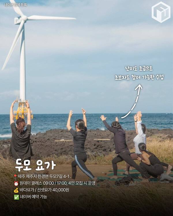 요가 초보자도 참여할 수 있는 수업 구성으로, 제주에서 특별한 인증샷을 남기고 싶은 분들에게도 추천할 만합니다.