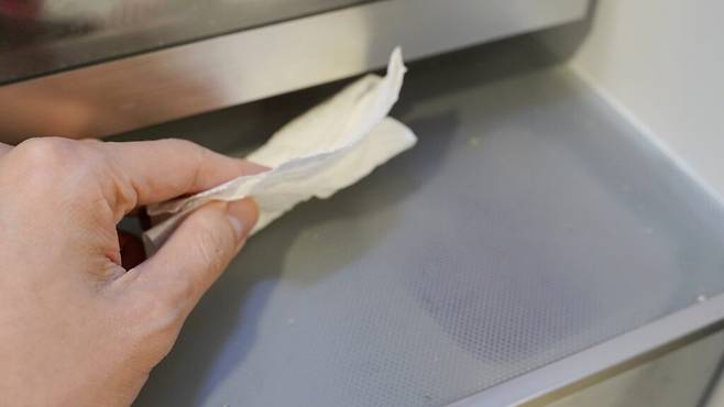 수건에 식초물을 적셔 냉장고의 선반과 서랍을 닦아주세요.