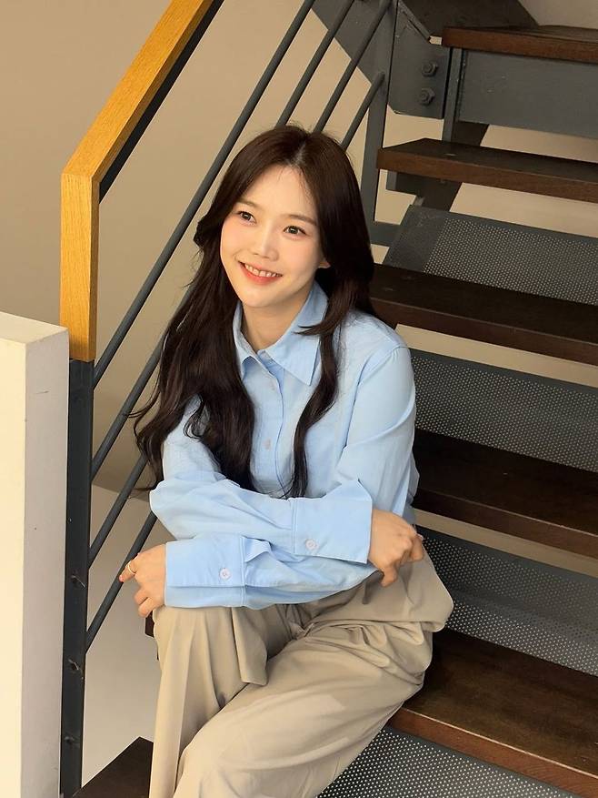 효정은 블랙 벨트로 허리선을 강조해 깔끔한 라인을 잡아주었으며, 심플하지만 세련된 오피스 캐주얼 무드를 보여주었다. 사진 배경은 실내 계단과 조명으로 따뜻한 느낌을 살려주었고, 효정 특유의 환한 미소가 룩 전체에 밝은 에너지를 더했다.