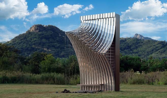 현대자동차그룹이 26일 개막한 '제5회 서울도시건축비엔날레'에 참여해 직접 디자인한 도시건축 조형물 '수연재(水然齋, The Healing Wall)'를 선보였다.