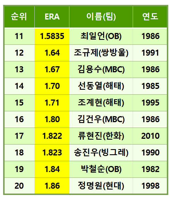 한편 이 부문 역대 20위 안에 베어스 투수는 2명 더 있다. 1986년 최일언(1.5835)이 11위이며, 원년 ERA 1위 박철순의 1.84는 역대 19위에 자리하고 있다.