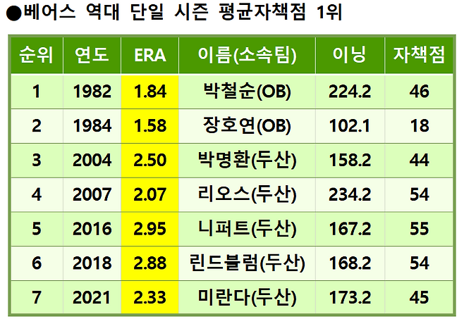 2007년 다니엘 리오스(2.07)가 베어스 구단 최초로 ERA 1위 외구인 투수가 됐고, 2016년 더스틴 니퍼트(2.95)와 2018년 조쉬 린드블럼(2.88), 2021년 아리엘 미란다(2.33)가 뒤를 이었다.