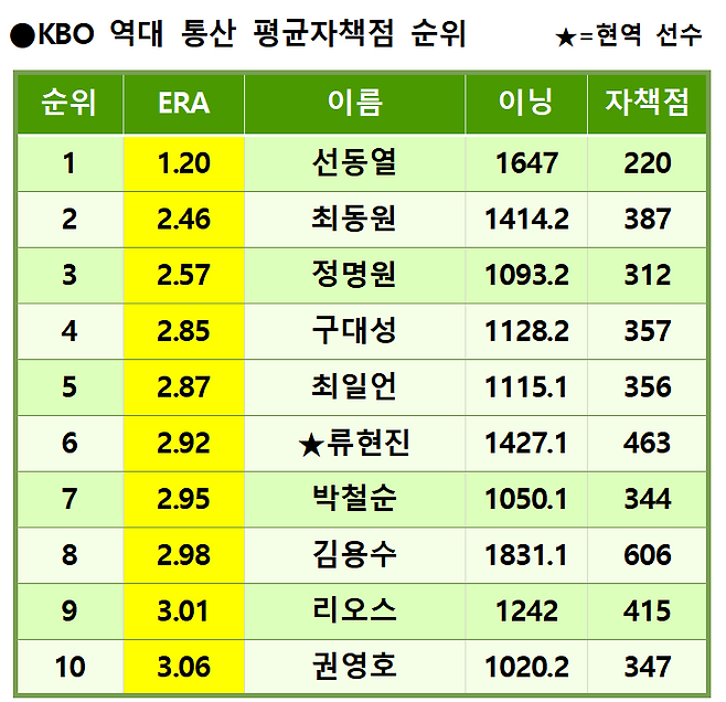 역대 2위는 최동원으로 2.46이다. 6위에 있는 류현진은 현역 선수이기에 향후 기록과 순위 변동성이 있다. 2006년부터 2024년까지 KBO 8시즌(MLB 진출 2013~2023년 제외) 동안 2.92를 기록했는데, 은퇴할 때까지 2점대를 지켜낼지도 관심사다.
