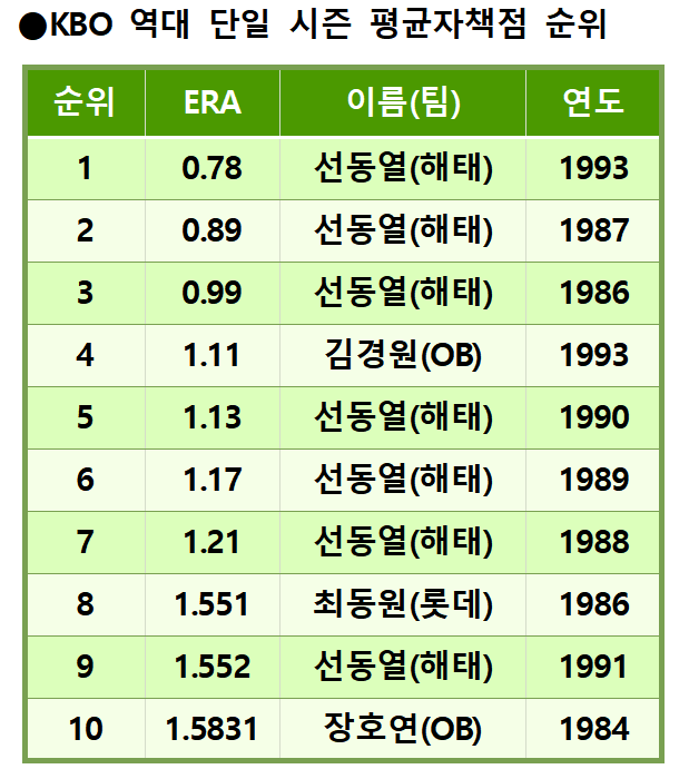 역대 단일 시즌 평균자책점을 놓고 보면 선동열은 3차례나 0점대를 찍었다.