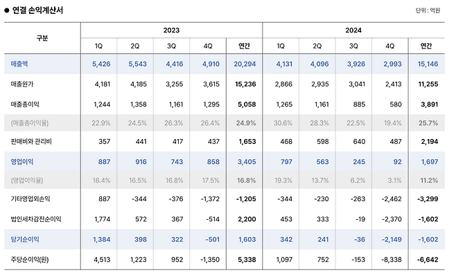아이에스지주의 전체 계열사 수는 32개이며 2024년 연간 실적으로 매출 1조6660억원, 순손실 3320억원을 각각 기록했다. 전년 대비 매출은 31.52% 급감했고 순이익 3200억원에서 적자 전환했다.