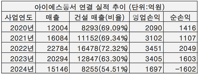 건설사업 매출은 2021년 1조원을 넘긴 뒤 2022년 1조6478억원을 정점으로 감소 추세로 2024년 8255억원을 기록했다. 건설사업이 축소되면서 전체 매출도 줄고 있으며 2022년 2조2784억원에서 2023년 2조294억원, 2024년 1조5146억원 등을 기록했다.