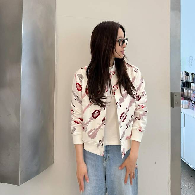 함은정은 화이트 컬러의 프린트 점퍼와 심플한 흰 티셔츠, 연청 데님 팬츠를 매치해 산뜻한 캐주얼룩을 연출하고 있다. 자연스럽게 풀어진 긴 머리와 미니멀한 스타일링이 편안하면서도 세련된 분위기를 자아낸다. 전체적으로 밝은 컬러를 활용해 경쾌한 이미지를 강조했다.