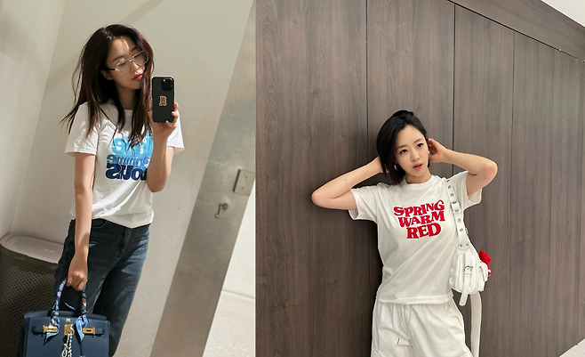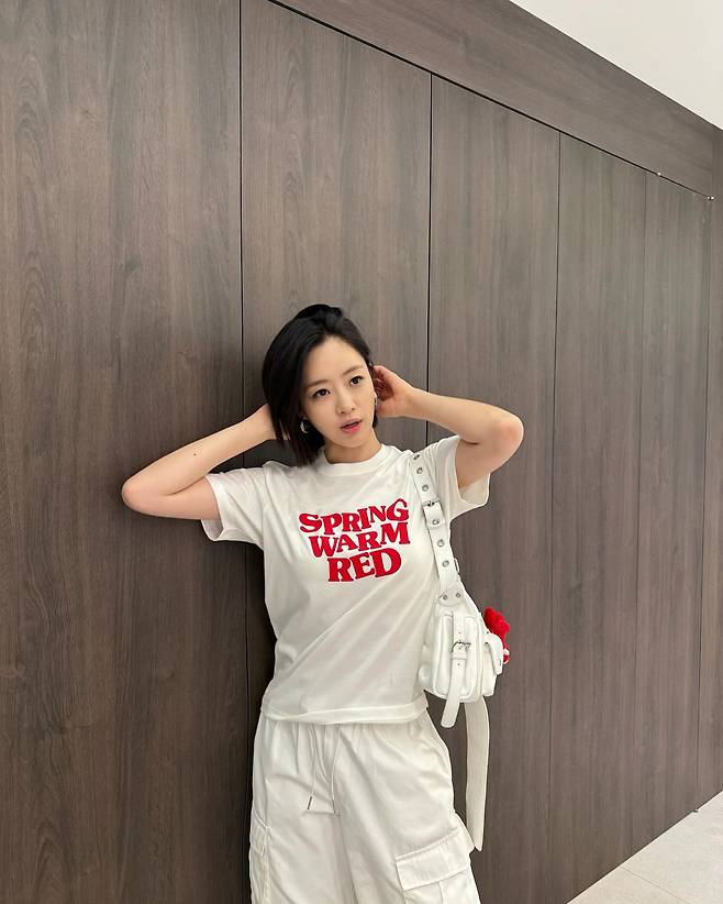 ‘SPRING WARM RED’ 레터링이 인상적인 화이트 티셔츠와 화이트 카고 팬츠를 매치해 올화이트 룩을 선보였다. 여기에 화이트 미니백과 레드 참 장식으로 통일감을 주면서도 포인트를 더했다. 밝고 경쾌한 분위기가 돋보이는 스타일이다.