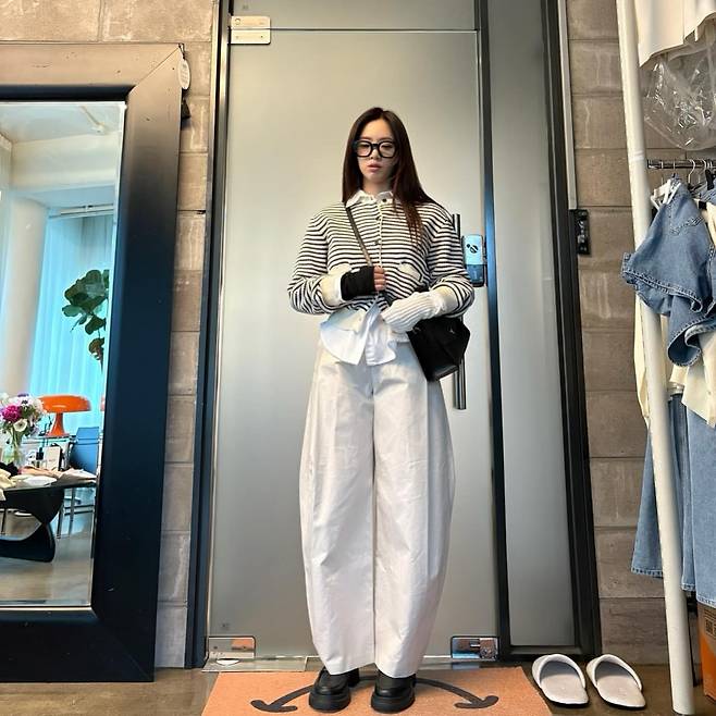 네 번째 스타일에서는 스트라이프 니트와 화이트 벌룬 팬츠, 블랙 앵클부츠를 조합해 모던한 캐주얼룩을 연출하고 있다. 크로스백과 레이어드된 셔츠 디테일이 스타일에 입체감을 더하며, 전체적으로 도시적이고 세련된 이미지를 완성했다.