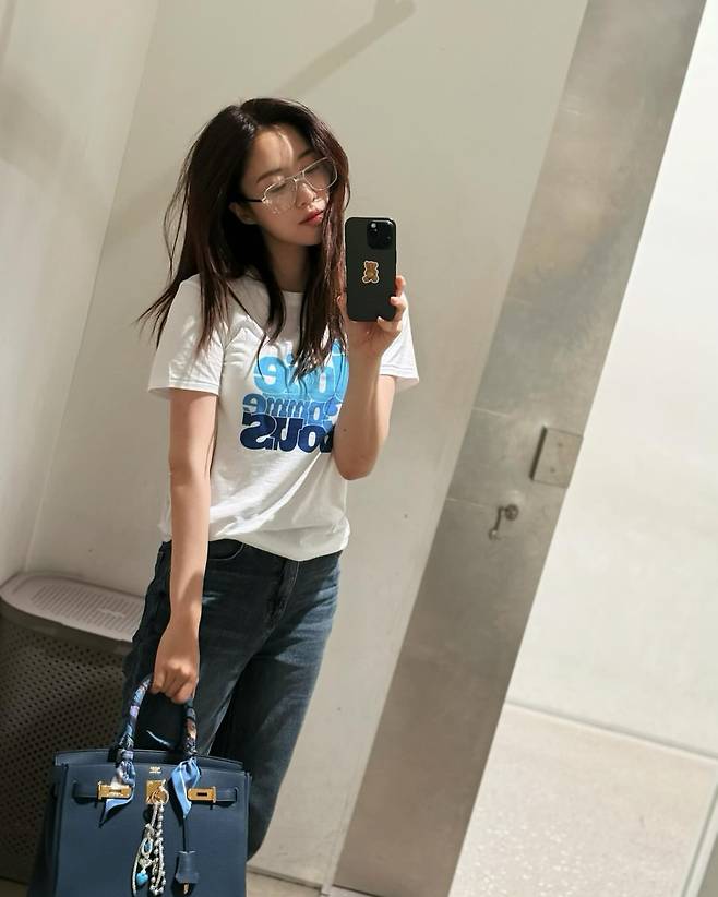화이트 티셔츠에 블루 계열의 그래픽 프린트가 돋보이는 두 번째 스타일은, 진청 데님 팬츠와 네이비 컬러의 토트백을 매치해 캐주얼하면서도 트렌디한 무드를 완성했다. 백에 스카프와 참 장식을 더해 포인트를 주었으며, 전체적으로 실용적이면서도 감각적인 스타일링이 눈길을 끈다.