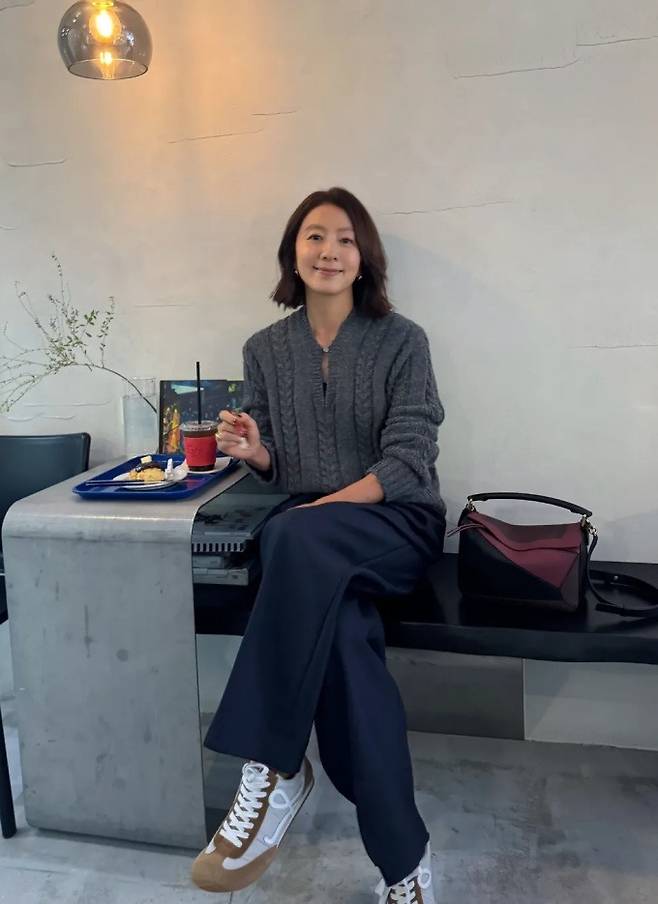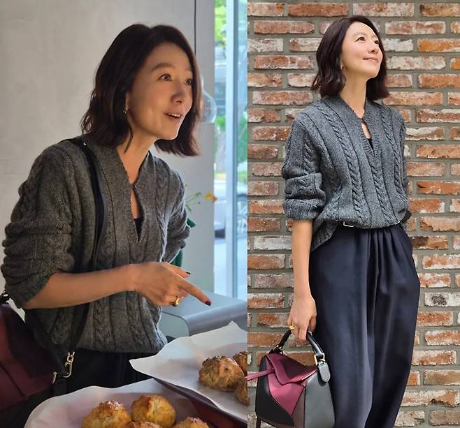 김희애는 짙은 그레이 컬러의 케이블 니트를 루즈하게 착용하고, 여유로운 실루엣의 네이비 팬츠와 매치해 감각적인 꾸안꾸 가을 외출룩을 완성했다.