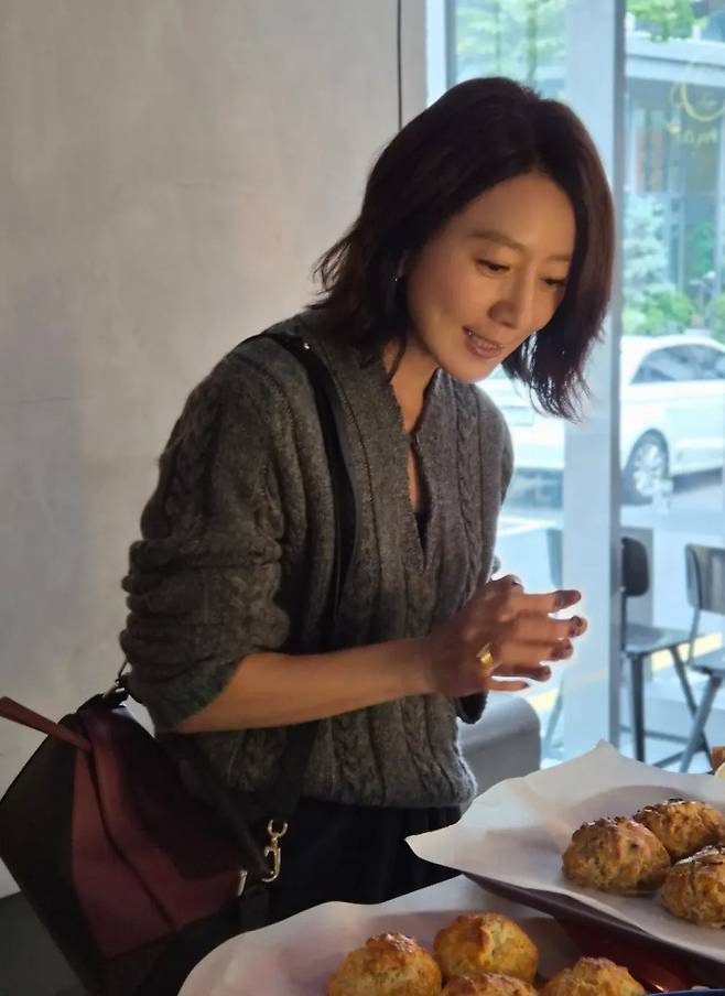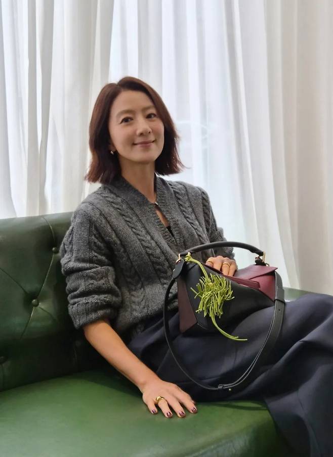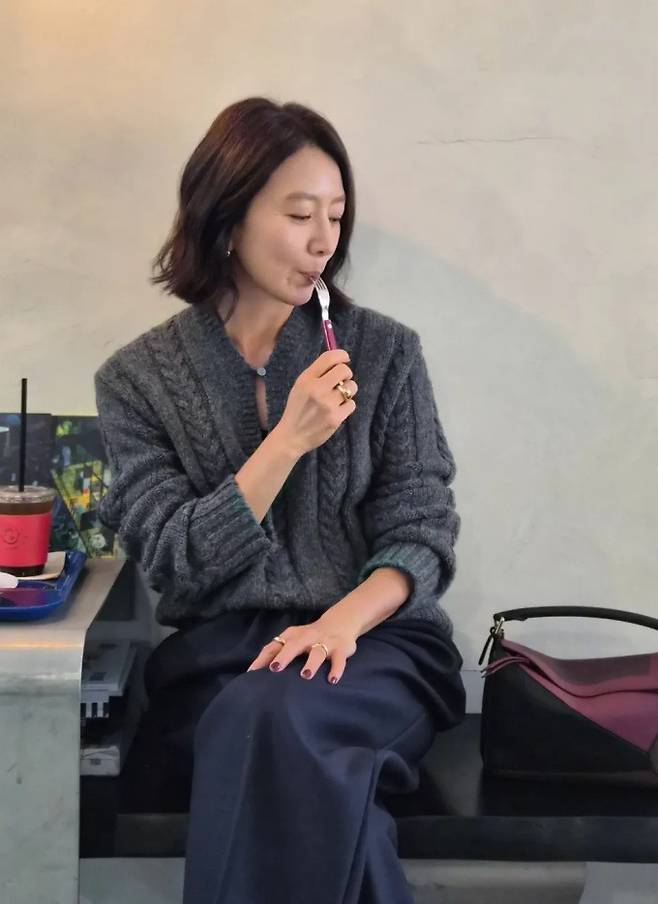 배우 김희애가 그레이 케이블 니트로 세월 비껴간 우아한 미모를 드러냈다.