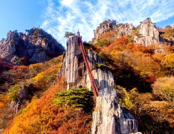 특히 대둔산의 명물인 빨간 삼선 계단은 아찔함과 스릴은 물론 하늘을 가로지르는 생경한 느낌이 마치 신선이 된 듯한 특별한 경험을 만끽할 수 있어 가을철 추천드리는 단풍 명소입니다.