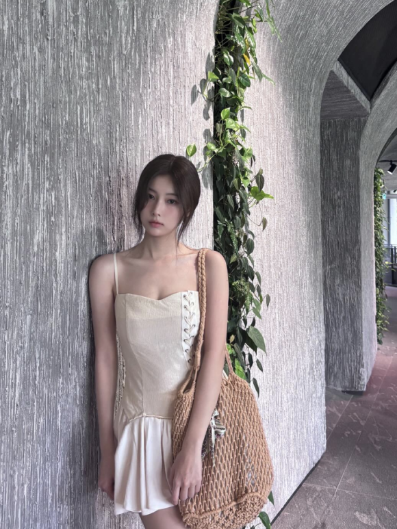 어깨 라인을 자연스럽게 드러내는 슬리브리스 컷과 함께, 전면 레이스업 디테일이 허리라인을 살짝 잡아줘 날씬해 보이는 효과도 기대할 수 있다.