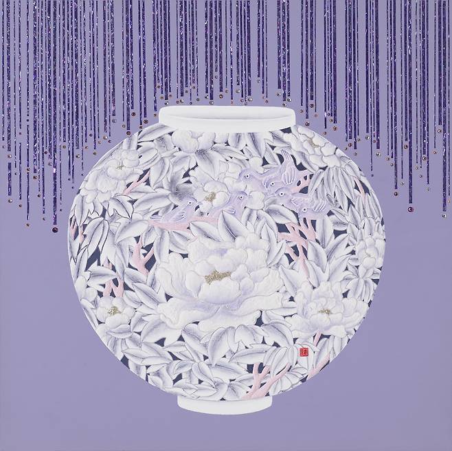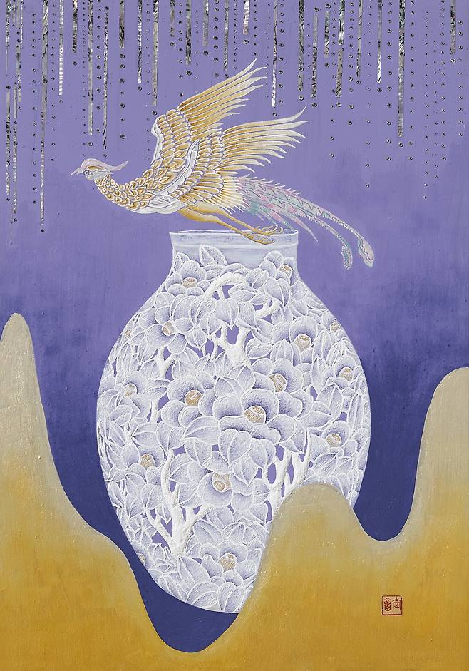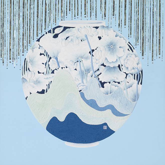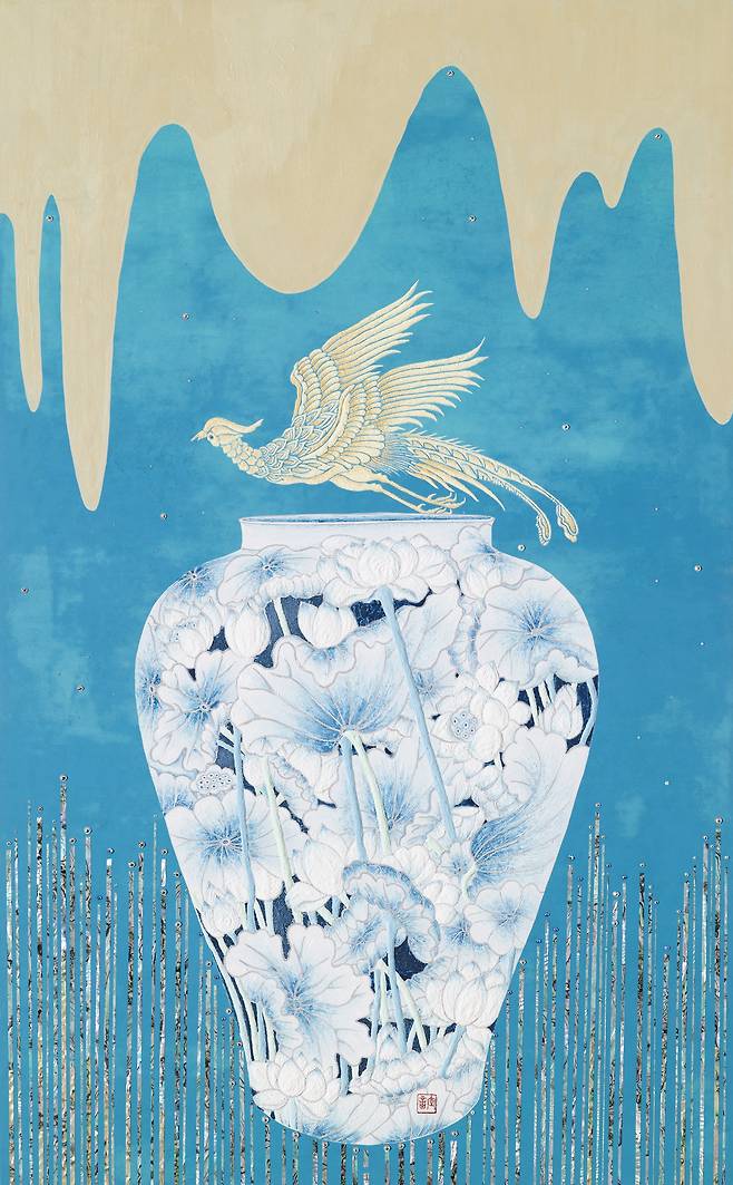 도자 해석에 있어서도 ‘18세기 백자투각모란당초문 호’, 크리스티 경매에서 낙찰된 ‘백자이중투각항아리’, 한국미감의 대표브랜드인 ‘달항아리’ 등을 포착해 국보(國寶)가 보여주는 최고수준의 전통미감과 현대적 색채미감을 콜라주하는 ‘한국화의 하이브리드’를 선보인다. 흔히 우리는 백색미감을 한국미감이라 착각하곤 한다. 하지만 전통 시대부터 면면히 내려오는 채색화의 혼은 우리가 다양한 색채와 리드미컬한 에너지 속에서 ‘새로운 가치’를 향해 가는 ‘하이브리드(융합/조화의 가치)’한 면모가 있음을 보여준다.