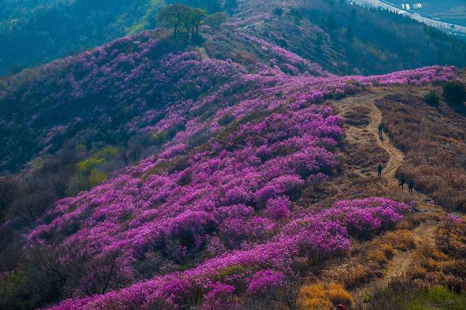 둘째, 군락의 규모예요. 단순히 몇 그루가 모여 있는 수준이 아니라 능선을 따라 흐르는 ‘거대한 띠’처럼 이어져 있어 어느 방향을 봐도 진달래가 시야에 들어옵니다.