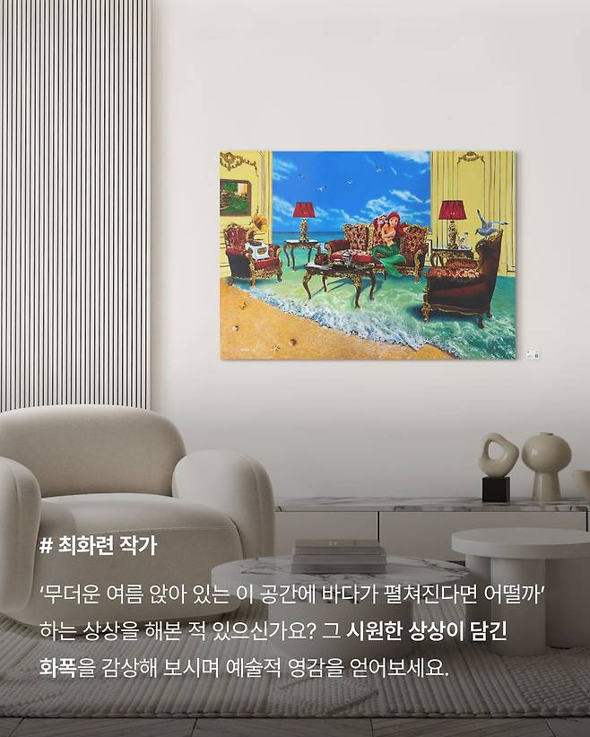여러분은 어린 시절, 거실 소파에 앉아 어떤 상상을 하셨나요? 무더운 여름, 앉아 있는 이 공간에 바다가 펼쳐진다면, 드넓은 들판이 펼쳐진다면 어떨까 하는 상상은 해본 적 없으신가요? 최화련 작가의 작품에는 아주 시원한 상상력이 깃들어있습니다. 인어, 피노키오 등 우리에게 너무나 친숙한 동화 속 등장인물이 거실 소파 위나 주변에 앉아있는 것을 볼 수 있죠. 그런데 그 장소가 조금 특이합니다. 초원과 바다가 펼쳐진 거실. 조금 이상하지 않나요? 우리의 어린 시절 무궁무진했던 추억과 동심이 실제 화폭에 담겨있는 듯합니다. 매일 똑같은 공간 속 새로운 상상력을 불어넣어 보고 싶지 않으신가요? 최화련 작가님의 시원한 상상력으로 애정하는 공간에 포인트를 주는 것은 어떨까요?
