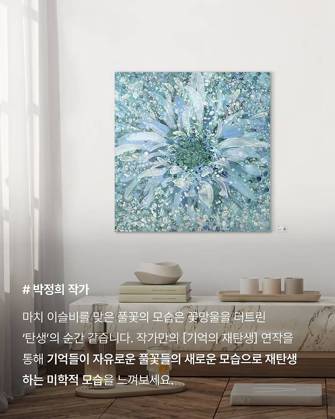 우리는 거리에서 풀꽃들을 쉽게 찾아볼 수 있습니다. 그 모습은 온유하고 평화로워 보이며, 피어난 모양새는 우리에게 자유로움으로 다가옵니다. 박정희 작가의 <기억의 재탄생> 연작은 거리의 자유로운 풀꽃들을 통해 기억들이 새로운 모습으로 재탄생하는 모습을 미학적으로 담아냅니다. 작가의 손끝에서 재탄생한 풀꽃들이 연결된 모습은 자유로움을 느끼게 해 주며, 명도 높은 색채는 긍정의 분위기를 자아냅니다. 작가는 작품의 의미는 작가가 아니라 관람자에 의해 결정된다고 말하며, 작품을 만난 관객들도 풀꽃처럼 지도 없이 떠나보는 자유로움을 느끼기를 바란다고 이야기합니다. 박정희 작가의 작품을 통해 자유로움을 탐구하는 예술의 즐거움과 창의적 영감을 경험해 보는 것은 어떨까요?