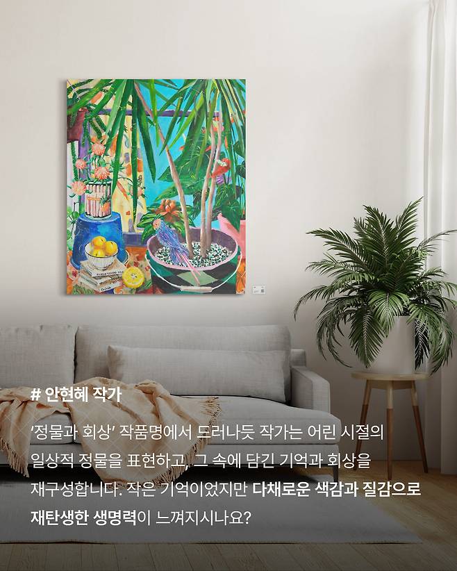 선명하고 화려한 색채와 질감이 눈을 사로잡는 안현혜 작가의 작품입니다. 인상주의 화가 폴 세잔(Paul Cézanne)의 작품에서 많은 영감을 받아 다시점화 기법을 통해 사물을 다양하게 재해석하는 것이 작가의 특징인데요. 유화와 아크릴 물감을 사용하여 질감을 강조하거나 선명한 색채를 드러냄으로써 작가는 사물의 외형적 미를 극대화하죠. 작가가 주로 그리는 소재는 창가의 화분들과 일상에서 찾기 쉬운 사물들인데요. 작가는 사물들을 가만히 관찰하며 어린 시절 느꼈던 감정이나 추억을 회상합니다. 여러 각도에서 바라보는 사물이 하나의 그림에 담겨 있어 더욱 독특하고 매력적인 작품이죠. 작가의 작품은 들여다볼수록 그 생명력과 강렬함에 점점 빠져들면서 작품 안에 놓인 사물을 보며 다양한 이야기를 상상해 보시는 건 어떨까요? 작가가 일상의 사소한 순간들을 재조명하며 특별함을 발견했듯이, 작품을 감상하며 아름다움을 찾으시길 바랍니다.