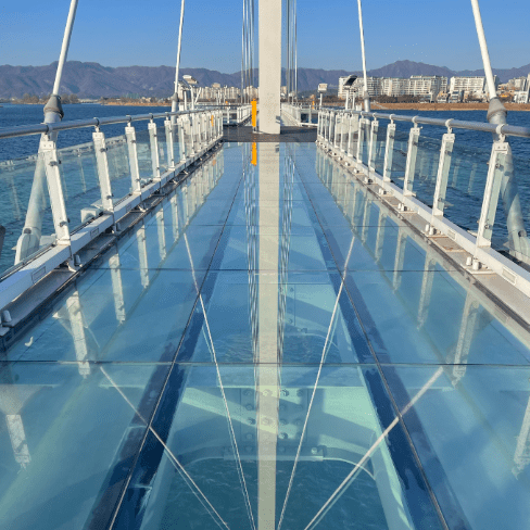 소양강과 소양강 처녀상 옆에는 소양강을 걸어볼 수 있는 스카이워크가 있습니다. 총 길이가 174m이며, 그중 156m 구간은 유리 바닥으로 된 구간으로 되어 있어 짜릿한 경험을 할 수 있죠. 유리 보호를 위해 입구에서 제공되는 덧신을 착용해야 한다는 점 참고하시길 바랍니다.