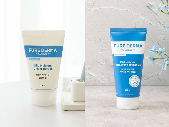 온더바디의 다이소 브랜드 '퓨어더마'의 신상, 마일드 모이스처 클렌징젤 & 세라마이드 페이스 & 바디수딩젤.