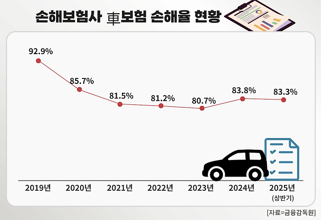 보험업계에 따르면 지난 9월 기준 5개 대형 손보사(삼성화재·메리츠화재·DB손해보험·현대해상·KB손해보험)의 자동차보험 손해율은 93.2%를 기록했다. 지난해 같은 기간보다 7.1%p 오른 수치다. 손해율은 보험사가 받은 보험료 대비 지급한 보험금의 비율을 뜻한다. 업계에서는 통상 80% 안팎을 손익분기점으로 평가하고 있다. 90%를 넘어서면 적자 구간에 진입한 것으로 평가된다.