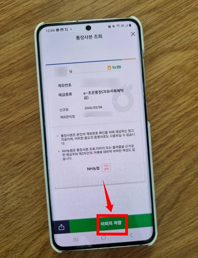 이렇게 통장사본이 나오면서 하단에 이미지 저장을 할 수 있게 되어있습니다.