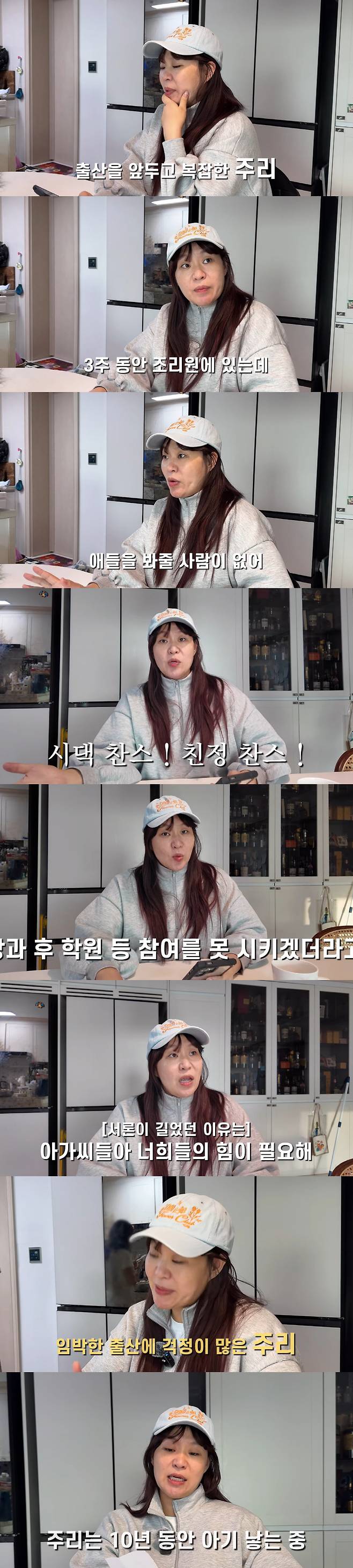 이날 정주리는 "내가 1월에 출산이다. 내가 조리원에 3주에 갈 동안 남편도 일을 간다. 그럼 집에 애들을 봐줄 사람이 없다"라며 걱정했다.