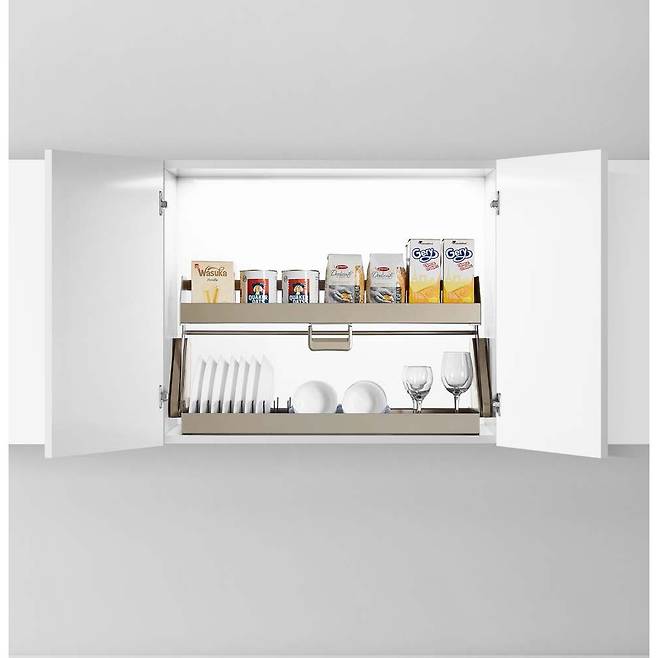 상부장은 손을 뻗어도 보통 밑부분만 사용할 수 있다. 누오미 리프트 다운 하드웨어를 상부장에 장착한다면 물건을 손쉽게 수납할 수 있다. 여기에는 무거운 식기류보다는 가벼운 양념류 혹은 티백류 등을 수납하면 좋다.