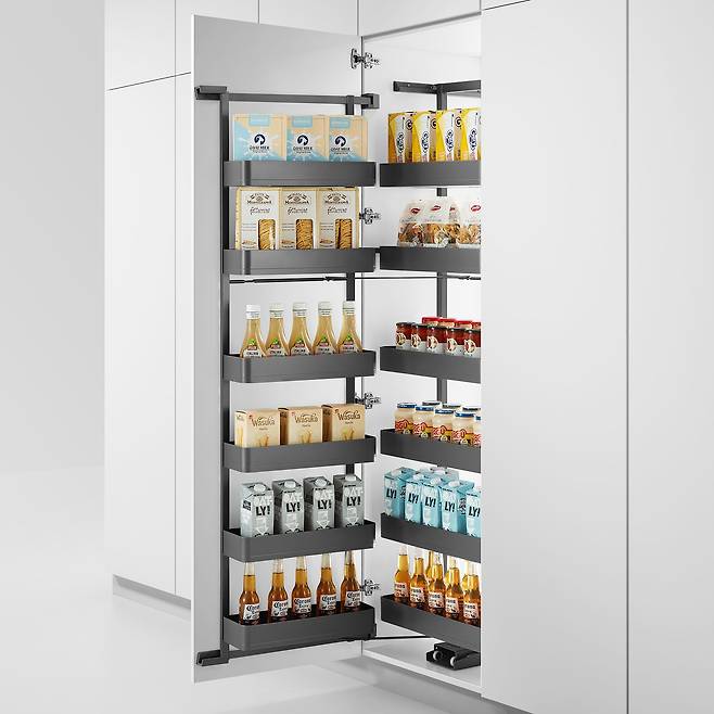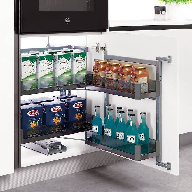 기존의 양념 수납장은 좁고 긴 형태의 인출식이기에 많은 수납에는 비효율적이었다. 누오미 2단 450 팬트리의 경우 문을 스윙형태로 열어 도어 2칸과 몸체 2칸, 총 4칸에 한 번에 수납·사용할 수 있다는 장점이 있다.