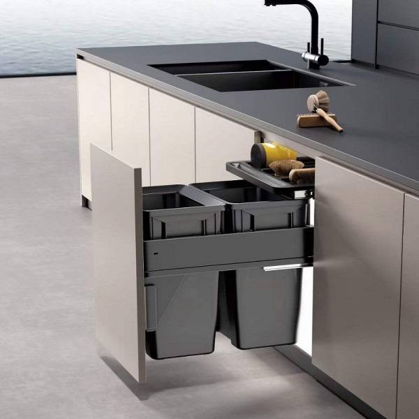 냉장고에 보관했던 가공식품의 포장을 벗긴 후 포장지를 버리러 휴지통까지 가야 하는 번거로움이 생길 때가 있다. 빌트인 휴지통은 주방 시공 후 위치를 고민하지 않아도 된다. 2칸을 모두 휴지통으로 사용해도 되고 분리수거를 위해 잠시 모아두는 공간으로 사용해도 좋다.