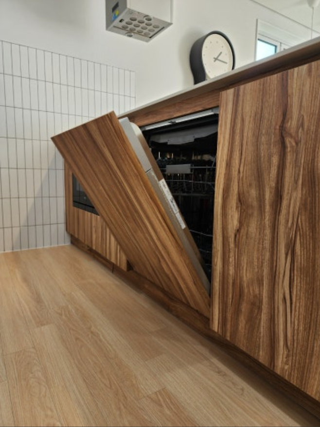 주방가구에서 필수 아이템이라면 식기세척기를 빼놓을 수 없다. 그중에서도 가구 패널형 빌트인 식기세척기는 식기세척기 도어 부분에 가구 패널을 붙이는 형태로 도어가 닫힌 상태에서 가구 하부장처럼 보이는 장점이 있다.