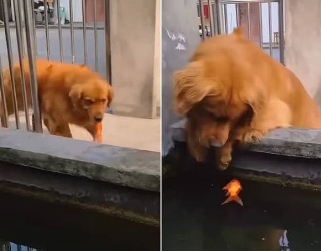 녀석이 달려간 곳은 다름 아니라 인근에 있는 연못이었는데요. 골든 리트리버 강아지는 간절한 마음을 담아 금붕어를 연못 안으로 집어 넣어주었습니다.