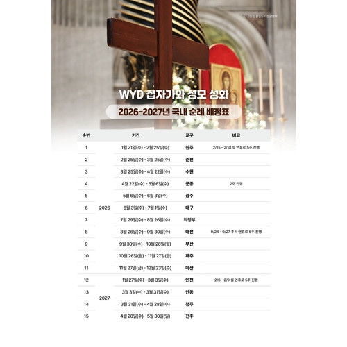 한국천주교주교회의는 WYD 십자가와 성모 성화의 공식 국내 순례가 21일 강원도 원주의 원주교구 주교좌 원동성당에서 시작된다고 13일 밝혔다. 십자가와 성모 성화는 전국 15개 천주교 교구를 순회한 뒤 내년 5월 30일 전주교구에서 여정을 마무리한다.