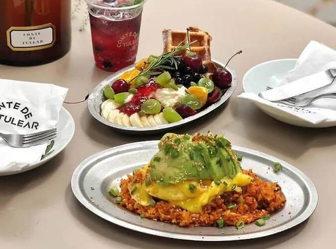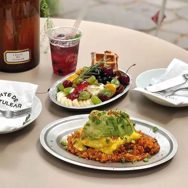향초, 디퓨저를 판매하는 매장에서 와인과 브런치를 먹을 수 있는 복합 문화 공간 ‘꽁티드툴레아’. 갈색 벽돌을 쌓아 올린 입구, 오래된 주택을 개조한 매장, 푸릇한 식물이 어우러진 테라스 등 매장 곳곳이 포토존으로 유명하다. 대표 메뉴 ‘Brioche Egg Waffle & Bacon’은 바삭한 와플 위로 문스터치즈와 모차렐라를 섞어 고소한 풍미를 더한 에그 스크램블과 두툼한 베이컨을 칼로 푹 찍어 고정했다. 와플 밑에는 시럽이 자작하게 깔려 있어 달콤함을 더한다. 짭조름한 베이컨, 부드러운 에그 스크램블, 달콤한 와플을 함께 먹으면 완벽한 단짠의 조화를 경험할 수 있다.